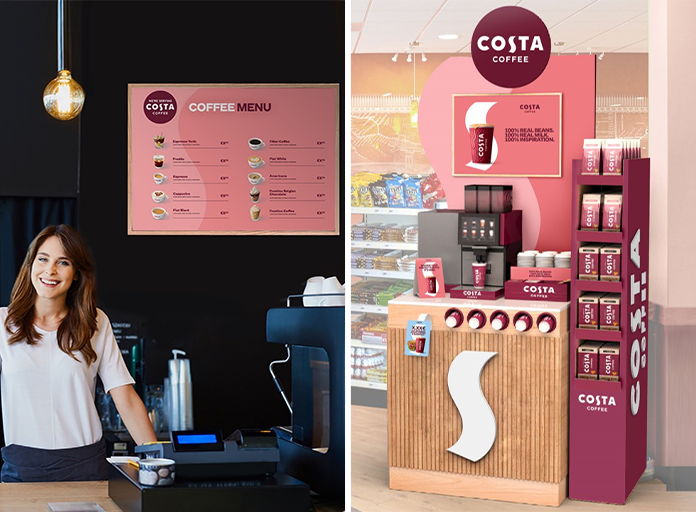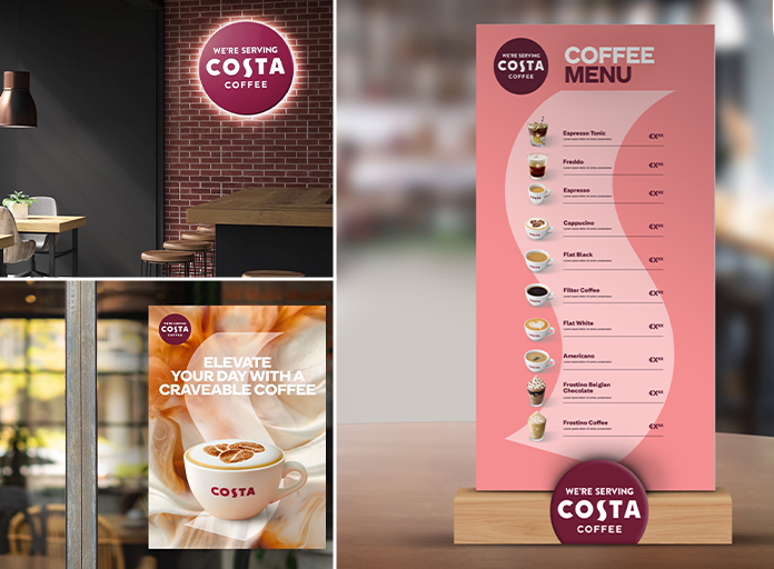 Begeistern, informieren und inspirieren Sie Ihre Kunden über die Costa Coffee Getränkeangebote in Ihrem Unternehmen durch vorgefertigte Marketingmaterialien, gebrandete Beschilderung und einsatzbereite Werbeinhalte.